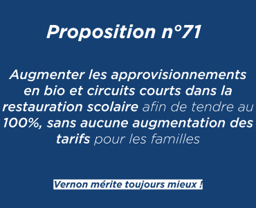 Augmenter les approvisionnements en bio et circuits courts dans la restauration scolaire afin de tendre au 100%, sans aucune augmentation des tarifs pour les familles.